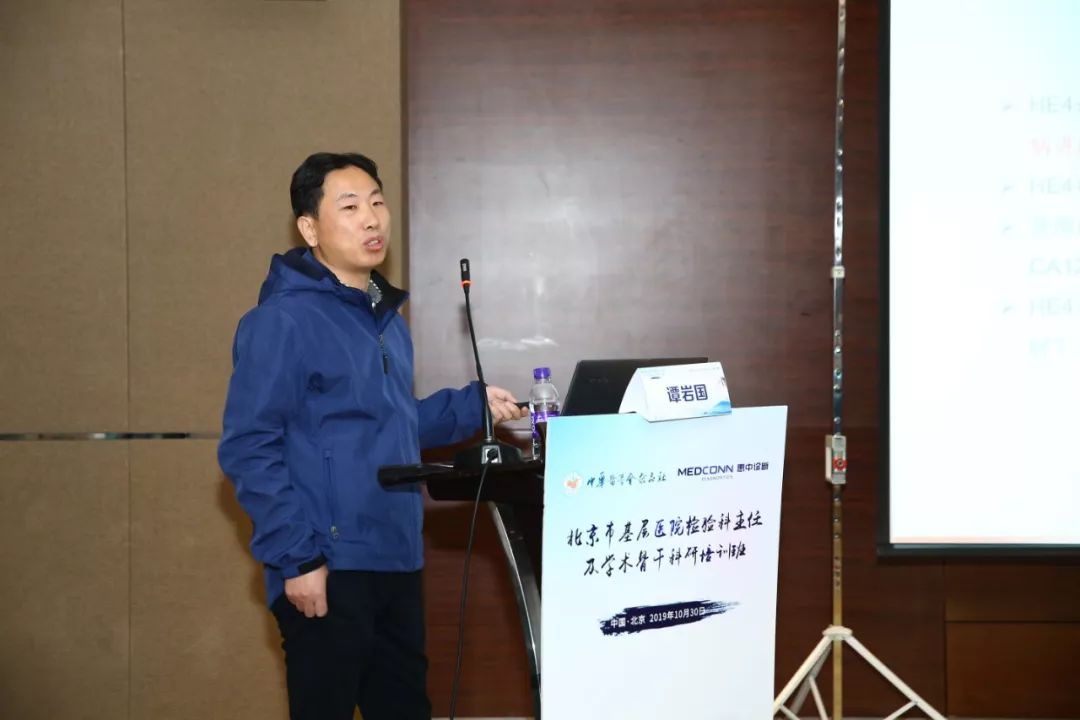 第四位是来自首都大学附属复兴医院检验科谭延国主任,他带来的交流课题是《联合检测血清CA125、CA125-Tn和HE4对卵巢癌的鉴别诊断价值》,他提出,卵巢癌发病隐匿,无成熟的早期诊断方法,确诊时约70%已属晚期,5年生存率为20-25%,治疗后即使已达临床完全缓解的病人,仍有70%将复发。CA125-Tn对鉴别同为CA125增高的良恶性包块可能更具意义,采取HE4联合CA125检测,不但能为临床诊断卵巢癌提供准确的检测结果,还能帮助临床医生更好的判断盆腔肿块的良恶性。