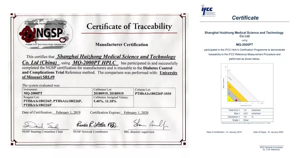 MQ系列产品通过美国国家血红蛋白标准化计划(NGSP)和国际临床化学协会(IFCC)的认证,检测结果可溯源至上述权威机构,符合全球检测结果标准化、精密度和准确度的要求